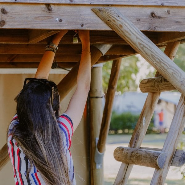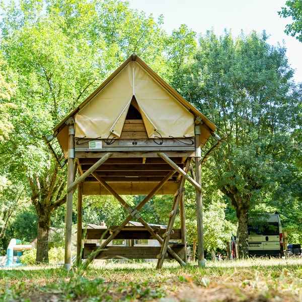 Sie lieben Abenteuer, möchten aber nicht auf einen erholsamen Schlaf verzichten? Dann ist das Biwakzelt genau das Richtige für Sie! Es ist kompakt und gemütlich und ideal für einen Aufenthalt zu zweit. Mit seinen optimierten 5 m² bietet Ihnen dieses kleine, erhöhte Zelt einen kuscheligen Rückzugsort, perfekt für eine Nacht inmitten der Natur. Es ist auch ideal für unsere Radtouristen, vereint Einfachheit und Stil und fügt sich perfekt in die Umgebung ein. Die Hütte, von der Sie als Kind geträumt haben, aber für Erwachsene gemacht! Als Bonus: ein Tisch und Bänke im unteren Bereich für Picknicks, die immer geschützt sind.